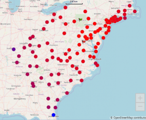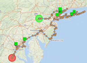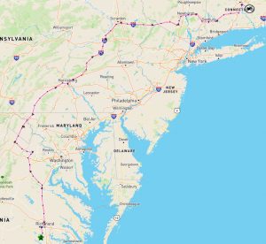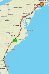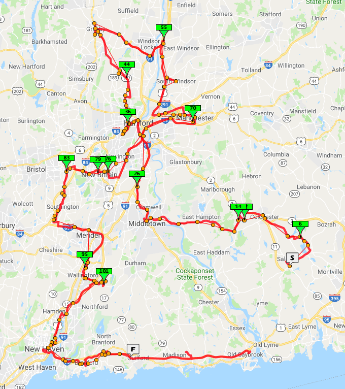 Some quick calculations convinced me that the way to win this was to get as many fast food bonuses as possible. In order to do that, it was necessary to get as many regular bonuses as possible. Due to the huge value of the fast food bonuses, the individual bonus points values were almost irrelevant. I had a little bit of luck in that when I arrived at work on Wednesday, the power was out for the whole building and the power company was forecasting many hours to get it fixed. My employer sent us all home giving me almost a whole day to work on my route. I settled on a route that went up into CT before returning through NYC, Long Island, down the Jersey Shore, through Baltimore and DC before ending up at the finish in Fredricksburg, VA. I was shooting for 14 Fast food bonuses. This route had the advantage of avoiding the ferry, it turns out that this was probably wise as I know of 2 people that did it, the first had their bike fall over enroute, and the second was technically canceled, but managed to talk their way on anyway.