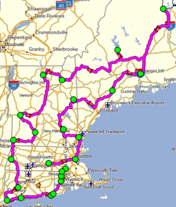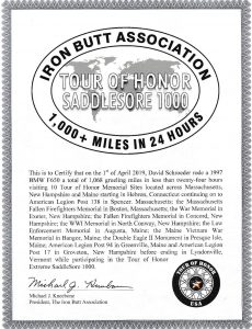 The Tour of Honor (ToH) and Iron Butt Association (IBA) have special certificates if you complete ToH sites during a SS1000 or BB1500 (1500 miles in 36 hrs). Looking at last years sites, to get all of the New England region sites would be about 1600 miles and take about 32hrs (not including stopped time). Getting the ToH memorials requires more time on secondary roads that one would typically choose for a certified ride making this is pretty aggressive for the BB1500 and all sites (you really only need 8 for the certificate).